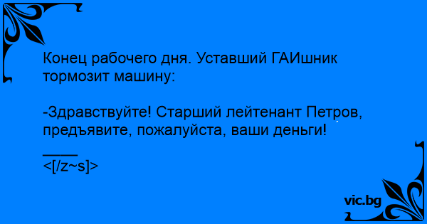 -Здравствуйте! Старший лейтенант Петров, предъявите, пожалуйста, ваши деньги! ____ <[/z~s]>