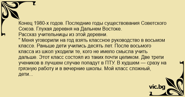 " Меня уговорили на год взять классное руководство в восьмом классе. Раньше дети учились десять лет. После восьмого класса из школ уходили те, кого не имело смысла учить дальше. Этот класс состоял из таких почти целиком. Две трети учеников в лучшем случае попадут в ПТУ. В худшем — сразу на грязную работу и в вечерние школы. Мой класс сложный, дети неуправляемы, в сентябре от них отказался очередной классный руководитель. Директриса говорит, что, если за год я их не брошу, в следующем сентябре мне дадут первый класс.