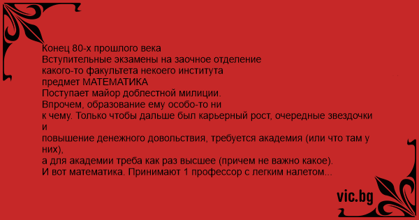Конец 80-х прошлого века Вступительные экзамены на заочное отделение какого-то факультета некоего института предмет МАТЕМАТИКА Поступает майор доблестной милиции.