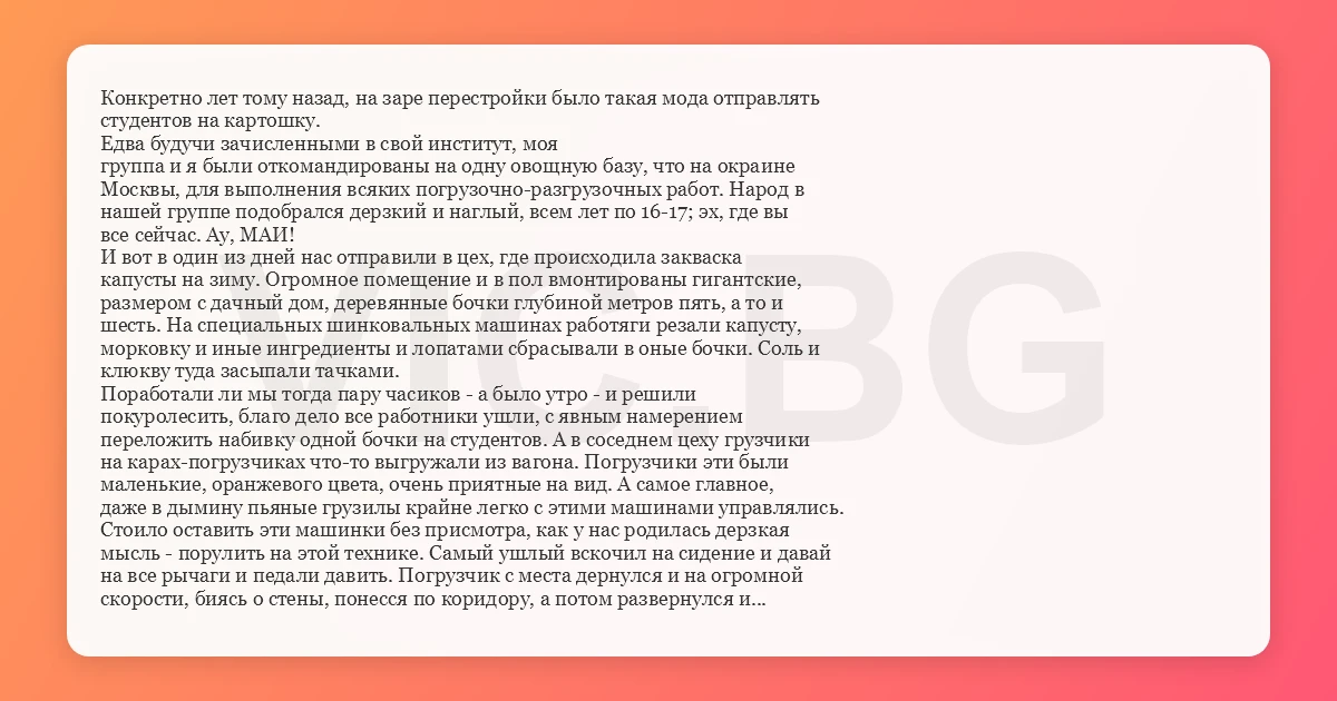 Конкретно лет тому назад, на заре перестройки было такая мода отправлять студентов на картошку. Едва будучи зачисленными в свой институт, моя группа и я были откомандированы на одну овощную базу, что на окраине Москвы, для выполнения всяких погрузочно-разгрузочных работ. Народ в нашей группе подобрался дерзкий и наглый, всем лет по 16-17; эх, где вы все сейчас. Ау, МАИ! И вот в один из дней нас отправили в цех, где происходила закваска капусты на зиму. Огромное помещение и в пол вмонтированы гигантские, размером с дачный дом, деревянные бочки глубиной метров пять, а то и шесть. На специальных шинковальных машинах работяги резали капусту, морковку и иные ингредиенты и лопатами сбрасывали в оные бочки. Соль и клюкву туда засыпали тачками. Поработали ли мы тогда пару часиков - а было утро - и решили покуролесить, благо дело все работники ушли, с явным намерением переложить набивку одной бочки на студентов. А в соседнем цеху грузчики на карах-погрузчиках что-то выгружали из вагона. Погрузчики эти были маленькие, оранжевого цвета, очень приятные на вид. А самое главное, даже в дымину пьяные грузилы крайне легко с этими машинами управлялись. Стоило оставить эти машинки без присмотра, как у нас родилась дерзкая мысль - порулить на этой технике. Самый ушлый вскочил на сидение и давай на все рычаги и педали давить. Погрузчик с места дернулся и на огромной скорости, биясь о стены, понесся по коридору, а потом развернулся и обратно. Когда парень подъехал к нам, от желающих сесть за руль не было отбоя. Набилось в этот гребаный кар человек десять - как обезьяны повисли на всех подножках и аккумуляторах. Новый водила оказался полным мудилой. Погрузчик так же лихо взял с места, только поехал задним ходом. Народ с него врассыпную, включая и «шофера». Кар проехал еще несколько метров и бухнулся в одну из бочек - пустую. Грохот был конкретный... Когда дым рассеялся, пришли на ум горькие мысли - типа письмо в деканат, пиздюли от всех и так далее. Все задались традиционным вопросом русской интеллигенции - Что делать? В смысле как скрыть следы беспредела. Спасительная идея пришла достаточно быстро. Один кадр предложил засолить этот гадский погрузчик, поскольку достать его было невозможно. Ну засыпать его капустой, морковкой, клюквой и солью. А про кар сказать что ничего и не видели, сами ищите. Идея имела успех. Все как ошалелые прикатили шинковалки со всего цеха и принялись заваливать этот погрузчик всем подряд. Работа спорилась. К концу смены бочка была наполовину полной. Все разошлись по домам. Через неделю наш лазутчик сходил в цех и доложил, что почти все бочки, включая нашу, забиты, закрыты и лежат под тяжким гнетом. Кар объявлен в угон. Видимо и посейчас этот кар там так и квасится, а может и растворился уже, соли мы не жалели. А может и нашли его через годик, вот удивились, наверное! До сих пор хочу представить вкус капусты их той бочки. Видимо, что-то со стойким ароматом электролита и тонкой нотой машинного масла... © Духифат, 2002 г.