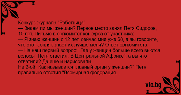 — Знаем ли мы женщин? Первое место занял Петя Сидоров, 10 лет. Письмо в оргкомитет конкурса от участника: