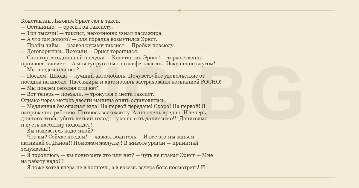Константин Львович Эрнст сел в такси. — Останкино! — бросил он таксисту. — Три тысячи! — таксист, несомненно узнал пассажира. — А что так дорого? — для порядка возмутился Эрнст. — Прайм-тайм. — развел руками таксист — Пробки повсюду. — Договорились. Поехали — Эрнст торопился. — Спонсор сегодняшней поездки — Константин Эрнст! — торжественно произнес таксист — А моя супруга пьет нескафе-классик. Искушение вкусом! — Мы поедем или нет? — Поедем! Шкода — лучший автомобиль! Почувствуйте удовольствие от поездки на шкоде! Пассажиры и автомобиль застрахованы компанией РОСНО! — Мы поедем сегодня или нет? — Вот теперь — поехали. — тронулся с места таксист. Однако через метров двести машина опять остановилась. — Медленная безопасная езда! На первой передаче! Скоро! На первой! Я напряженно работаю. Питаюсь всухомятку. А это очень вредно! И теперь, для того чтобы убить легкий голод — у меня есть даниссимо!!! Даниссимо — и пусть пассажир подождет!! — Вы издеветесь надо мной? — Что вы? Сейчас поедем! — чавкал водитель — И все это мы запьем активией от Данон!! Поможем желудку! В животе ураган — принимай эспумезан!! — Я тороплюсь — вы понимаете это или нет? — чуть не плакал Эрнст — Мне на работу надо!!! — Я тоже хотел вчера не в полночь, а в восемь вечера бокс посмотреть! И посмотреть бокс весь!! Без перерывов на твою долбаную рекламу!!! Поэтому сядь и сиди!!! Поедем! Скоро!! На первой!!! (c) frumich