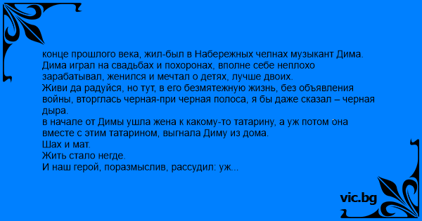 конце прошлого века, жил-был в Набережных челнах музыкант Дима. Дима играл на свадьбах и похоронах, вполне себе неплохо зарабатывал, женился и мечтал о детях, лучше двоих. Живи да радуйся, но тут, в его безмятежную жизнь, без объявления войны, вторглась черная-при черная полоса, я бы даже сказал – черная дыра. в начале от Димы ушла жена к какому-то татарину, а уж потом она вместе с этим татарином, выгнала Диму из дома. Шах и мат. Жить стало негде. И наш герой, поразмыслив, рассудил: уж лучше негде жить в Москве, чем в Набережных челнах. Вот он собрал все свои вещи (которые не пригодились татарину) – гитару и рюкзак с музыкальными дисками, купил плацкартный билет и поехал покорять столицу. Почти на все деньги Дима снял квартирку в новостройке – совсем пустую, без мебели и даже без пола, и с утра до вечера бегал по городу в поисках путей покорения Москвы. Покорение началось с трагической утраты любимой гитары, в следствие показательного мордобоя на Старом Арбате. Новых уличных гитаристов там не очень любят, своих девать некуда. Димина морда сильно опухла и перестала походить на фотку в паспорте и это, разумеется не бесплатно, подтверждал каждый встреченный эксперт в ментовской форме. Деньги почти совсем закончились, а с фингалами ходить на собеседования – только людей смешить. Еще неделя и нужно будет за квартиру платить. А тут еще и день рождения совсем не добавлял радости - это ведь не просто день рождения, а серьезная дата - 40 лет. Проснулся Дима среди ночи от твердого, холодного пола, подкачал надувной матрас, снова лег, подумал и решил: хpeн с ними с последними деньгами. Все же у меня сегодня юбилей. Что я, не человек? Куплю-ка я большой, вкусный торт, заварю чайку и устрою себе настоящий праздник. И ничего, что без гостей, мне больше достанется. Наступил вечер. Дима с ножом сидел на полу перед большим шоколадным тортом и аккуратно прицеливался, куда бы его пырнуть, а на душе от чего-то стало так невыносимо тоскливо, что хоть в окошко сигай: - Ну, какой, нахрен, юбилей? Какой торт? Столько бабок на него извел. А завтра что? Сорокалетний дядька, рожа разбита как у бомжа с теплотрассы, а веду себя как маленький мальчик! Дима присмотрелся к коробке из под торта и понял – вот его шанс. Тортик-то оказался на один день просроченным. Нужно аккуратно запаковать его, благо чек не выбросил, и поскорее сдать обратно в магазин. Оставшихся денег, плюс возврата за торт, должно хватить на билет до Челнов, там все же хоть какие-то люди, не то, что здесь, пустыня… Сказано – сделано, Дима упаковал торт, спустился на лифте и вышел из подъезда. Вдруг видит: по двору медленно, но уверенно катится маленькая Тойота с настежь распахнутой водительской дверью, а за ней семенит женщина и смешно кричит: - Ой! Ой! Ай! Ай! Ой! Ой! Она открывала гараж и, видимо, не поставила машину на «ручник». Тойота уже хорошенько разогналась и целилась прямо в бок дорогому черному Мерседесу. Дима стоял совсем рядом с «Мерсом», но, при всем желании, руками машину не остановить и ему ничего другого не оставалось, как подсунуть между машинами свой многострадальный, шоколадный торт. Раздался легкий «чвяк», торт расплющило на целый квадратный метр, зато на машинах ни одной царапинки, только застывшие шоколадные брызги. Подбежавшая хозяйка Тойоты долго благодарила своего находчивого спасителя с побитой рожей, и