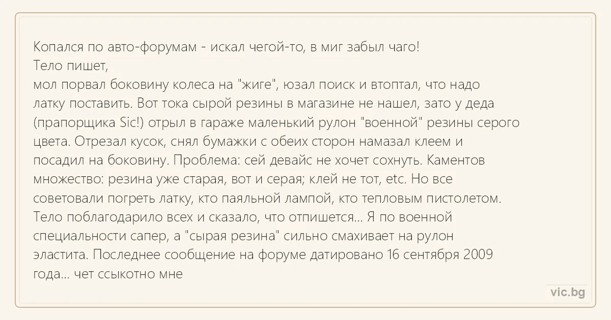 Копался по авто-форумам - искал чегой-то, в миг забыл чаго! Тело пишет, мол порвал боковину колеса на "жиге", юзал поиск и втоптал, что надо латку поставить. Вот тока сырой резины в магазине не нашел, зато у деда (прапорщика Sic!) отрыл в гараже маленький рулон "военной" резины серого цвета. Отрезал кусок, снял бумажки с обеих сторон намазал клеем и посадил на боковину. Проблема: сей девайс не хочет сохнуть. Каментов множество: резина уже старая, вот и серая; клей не тот, etc. Но все советовали погреть латку, кто паяльной лампой, кто тепловым пистолетом. Тело поблагодарило всех и сказало, что отпишется... Я по военной специальности сапер, а "сырая резина" сильно смахивает на рулон эластита. Последнее сообщение на форуме датировано 16 сентября 2009 года... чет ссыкотно мне