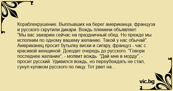 Кораблекрушение. Выплывших на берег американца, француза и русского скрутили дикари. Вождь племени объявляет: