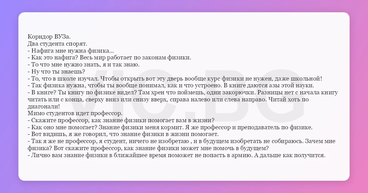 - Так я же не профессор, я студент, ничего не изобретаю , и в будущем изобретать не собираюсь. Зачем мне физика? Вот скажите профессор, как знание физики может мне помочь в будущем?