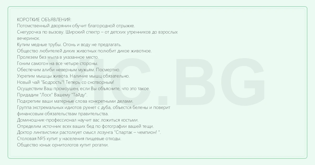 КОРОТКИЕ ОБЪЯВЛЕНИЯ: Потомственный дворянин обучит благородной отрыжке. Снегурочка по вызову. Широкий спектр – от детских утренников до взрослых вечеринок. Купим медные трубы. Огонь и воду не предлагать. Общество любителей диких животных полюбит дикое животное. Пролезем без мыла в указанное место. Гоним самогон на все четыре стороны. Обеспечим алиби неверным мужьям. Посмертно. Укрепим мышцы живота. Наличие мышц обязательно. Новый чай "Бодрость"! Теперь со снотворным! Осуществим Ваш промоушен, если Вы объясните, что это такое. Придадим "Лоск" Вашему "Тайду". Подкрепим ваши матерные слова конкретными делами. Группа экстремальных идиотов рухнет с дуба, объестся белены и поверит финансовым обязательствам правительства. Доминошник-профессионал научит вас ложиться костьми. Определим источник всех ваших бед по фотографии вашей тещи. Доктор лингвистики растолкует смысл лозунга "Спартак – чемпион! ". Столовая №5 купит у населения пищевые отходы. Общество юных орнитологов купит рогатки.