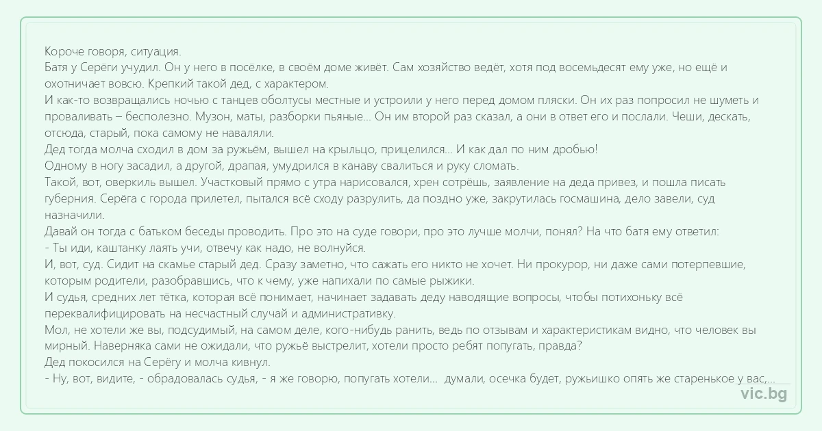 Такой, вот, оверкиль вышел. Участковый прямо с утра нарисовался, хpeн сотрёшь, заявление на деда привез, и пошла писать губерния. Серёга с города прилетел, пытался всё сходу разрулить, да поздно уже, закрутилась госмашина, дело завели, суд назначили.