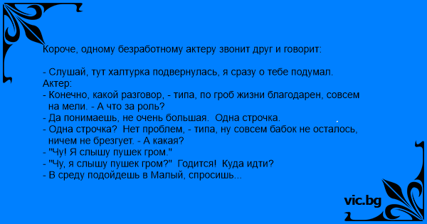 - Слушай, тут халтурка подвернулась, я сразу о тебе подумал. Актер: - Конечно, какой разговор, - типа, по гроб жизни благодарен, совсем на мели. - А что за роль? - Да понимаешь, не очень большая. Одна строчка. - Одна строчка? Нет проблем, - типа, ну совсем бабок не осталось, ничем не брезгует. - А какая? - "Чу! Я слышу пушек гром." - "Чу, я слышу пушек гром?" Годится! Куда идти? - В среду подойдешь в Малый, спросишь режиссера такого-то. - Заметано. В среду актер подходит в Малый, находит режиссера, тот: скажите строчку, актер с пафосом произносит: - Чу! Я слышу пушек гром! - Отлично, - говорит режиссер. - Роль ваша. Приходите в субботу к 7 вечера на спектакль. - Понял! - отвечает радостный актер. Ясное дело, от такого удачного поврота судьбы актер запивает по черному. Приходит в себя в субботу где-то в 6:30 и сломя голову бросается в театр, всю дорогу повторяя "Чу! Я слышу пушек гром". У театра его останавливает швейцар: ты, мол, куда без билета? - Я "Чу! Я слышу пушек гром", - объясняет актер. - А! Ты "Чу! Я слышу пушек гром", - успокаивается швейцар, - ну проходи. Актер - за кулисы. Его, ясное дело, не пускают. - Я "Чу! Я слышу пушек гром!", - кричит актер. - Ты "Чу! Я слышу пушек гром"? Опаздываешь! Давай срочно в гримерную! – кричат ему в ответ. Он - в гримерную. Гримерша: - Товарищ, вы кто? - Я "Чу! Я слышу пушек гром." - Вы "Чу! Я слышу пушек гром"? Что же вы опаздываете?! Садитесь вот тут, сейчас я вас быстренько. Актер, уже в гриме и в мыле, подбегает к сцене. Его перехватывет режиссер. - Ты "Чу! Я слышу пушек гром"? - Я "Чу! Я слышу пушек гром"! - Чуть не опоздал! Давай, твой выход! Актер выходит на сцену, и за спиной у него раздается оглушительный взрыв. Актер вздрагивает и орет: - ДА ВЫ ЧТО ТАМ, СОВСЕМ ОХУЕЛИ??!!!