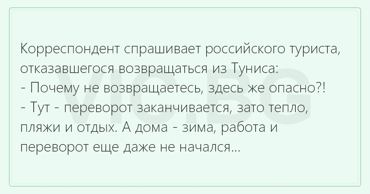 Корреспондент спрашивает российского туриста, отказавшегося возвращаться из Туниса: - Почему не возвращаетесь, здесь же опасно?! - Тут - переворот заканчивается, зато тепло, пляжи и отдых. А дома - зима, работа и переворот еще даже не начался...