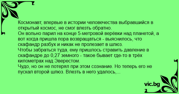 Космонавт, впервые в истории человечества выбравшийся в открытый космос, не смог влезть обратно.