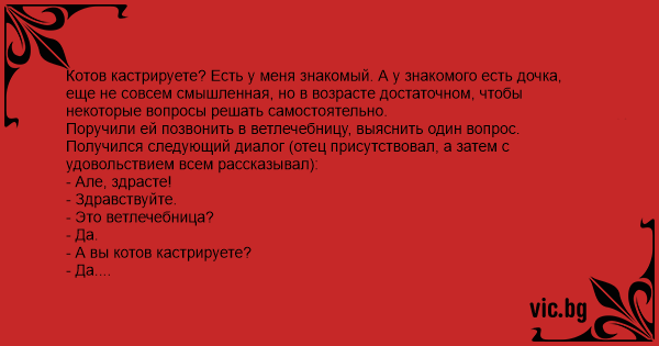 Котов кастрируете? Есть у меня знакомый. А у знакомого есть дочка, еще не совсем смышленная, но в возрасте достаточном, чтобы некоторые вопросы решать самостоятельно.