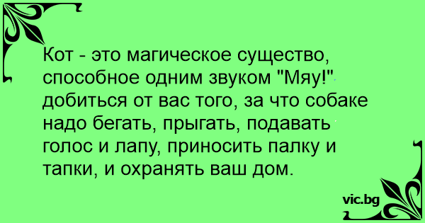 Кот - это магическое существо, способное одним звуком "Мяу!" добиться от вас того, за что собаке надо бегать, прыгать, подавать голос и лапу, приносить палку и тапки, и охранять ваш дом.