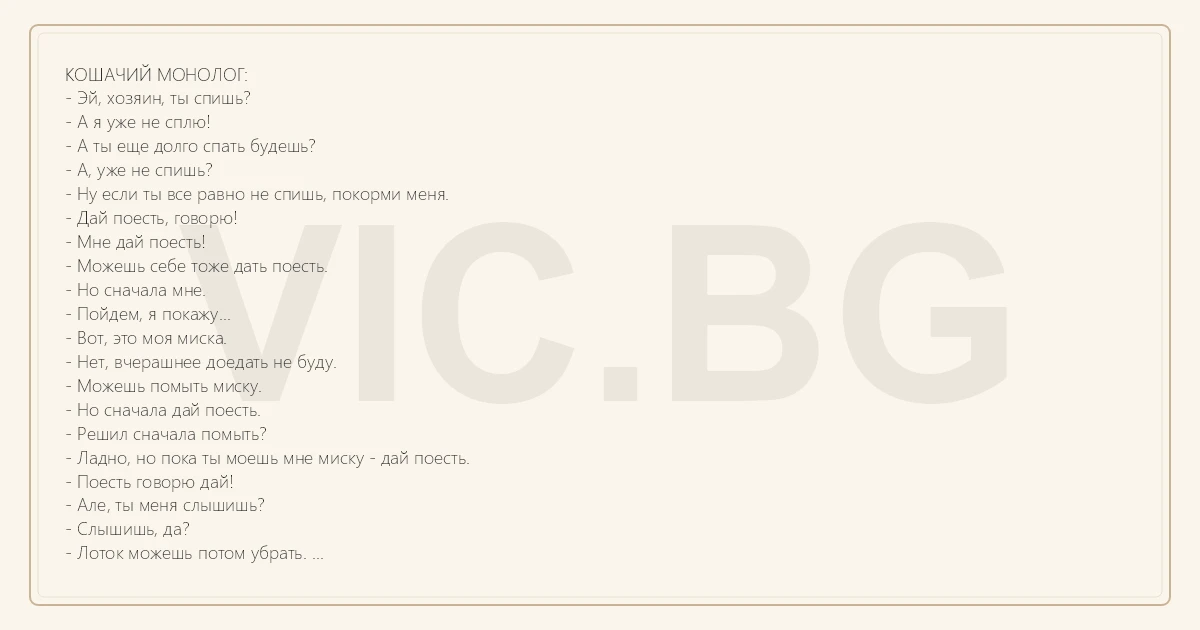 КОШАЧИЙ МОНОЛОГ: - Эй, хозяин, ты спишь? - А я уже не сплю! - А ты еще долго спать будешь? - А, уже не спишь? - Ну если ты все равно не спишь, покорми меня. - Дай поесть, говорю! - Мне дай поесть! - Можешь себе тоже дать поесть. - Но сначала мне. - Пойдем, я покажу... - Вот, это моя миска. - Нет, вчерашнее доедать не буду. - Можешь помыть миску. - Но сначала дай поесть. - Решил сначала помыть? - Ладно, но пока ты моешь мне миску - дай поесть. - Поесть говорю дай! - Але, ты меня слышишь? - Слышишь, да? - Лоток можешь потом убрать. - Уже убрал? - Ну тогда давай еще раз схожу, а то как-то чисто. - Все, я сходил, можешь убрать еще раз. - Но сначала поесть. - Давай! - Вот спасибо! - А что, ничего другого нет? - Нет, это я не буду. - Поищи что-нибудь еще. - Хозяин, за что?! - Я же ничего не сделал! - Ну ты скотина двуногая! - Хpeн ты у меня теперь позавтракаешь! - Иди, убирай, я посрал. - Теперь давай меня чесать. - Теперь гладить. - Теперь пузо. - Нет, не помогает, надо поесть. - Пойдем, ты меня покормишь. - Положи что-нибудь в миску. - А, ты уже положил? - Да, вот это уже вкуснее. - А еще дадут? - Давай еще. - Что это? - Нет, это я не буду... - Ладно, я спать...