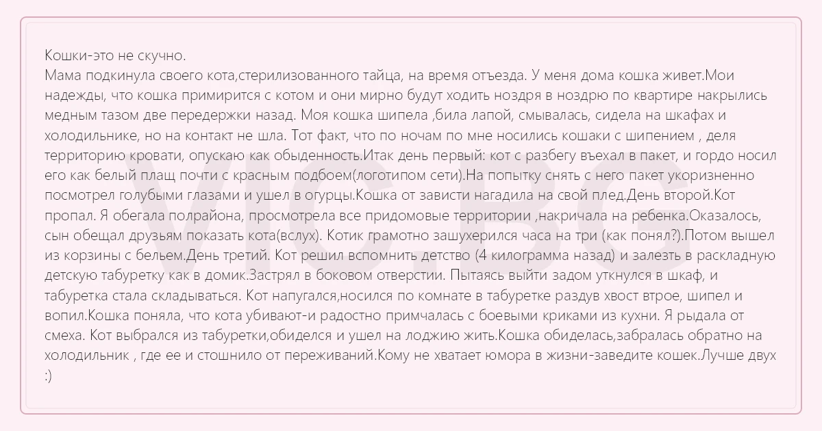 Мама подкинула своего кота,стерилизованного тайца, на время отъезда. У меня дома кошка живет.Мои надежды, что кошка примирится с котом и они мирно будут ходить ноздря в ноздрю по квартире накрылись медным тазом две передержки назад. Моя кошка шипела ,била лапой, смывалась, сидела на шкафах и холодильнике, но на контакт не шла. Тот факт, что по ночам по мне носились кошаки с шипением , деля территорию кровати, опускаю как обыденность.Итак день первый: кот с разбегу въехал в пакет, и гордо носил его как белый плащ почти с красным подбоем(логотипом сети).На попытку снять с него пакет укоризненно посмотрел голубыми глазами и ушел в огурцы.Кошка от зависти нагадила на свой плед.День второй.Кот пропал. Я обегала полрайона, просмотрела все придомовые территории ,накричала на ребенка.Оказалось, сын обещал друзьям показать кота(вслух). Котик грамотно зашухерился часа на три (как понял?).Потом вышел из корзины с бельем.День третий. Кот решил вспомнить детство (4 килограмма назад) и залезть в раскладную детскую табуретку как в домик.Застрял в боковом отверстии. Пытаясь выйти задом уткнулся в шкаф, и табуретка стала складываться. Кот напугался,носился по комнате в табуретке раздув хвост втрое, шипел и вопил.Кошка поняла, что кота убивают-и радостно примчалась с боевыми криками из кухни. Я рыдала от смеха. Кот выбрался из табуретки,обиделся и ушел на лоджию жить.Кошка обиделась,забралась обратно на холодильник , где ее и стошнило от переживаний.Кому не хватает юмора в жизни-заведите кошек.Лучше двух :)