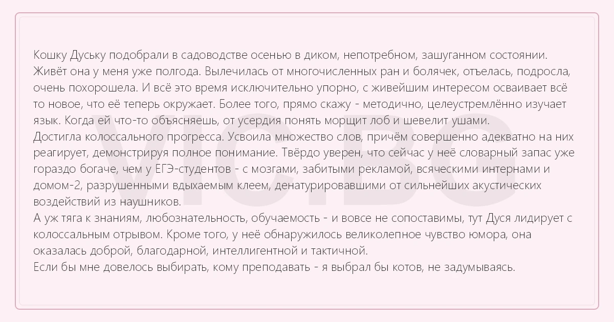 Кошку Дуську подобрали в садоводстве осенью в диком, непотребном, зашуганном состоянии. Живёт она у меня уже полгода. Вылечилась от многочисленных ран и болячек, отъелась, подросла, очень похорошела. И всё это время исключительно упорно, с живейшим интересом осваивает всё то новое, что её теперь окружает. Более того, прямо скажу - методично, целеустремлённо изучает язык. Когда ей что-то объясняешь, от усердия понять морщит лоб и шевелит ушами. Достигла колоссального прогресса. Усвоила множество слов, причём совершенно адекватно на них реагирует, демонстрируя полное понимание. Твёрдо уверен, что сейчас у неё словарный запас уже гораздо богаче, чем у ЕГЭ-студентов - с мозгами, забитыми рекламой, всяческими интернами и домом-2, разрушенными вдыхаемым клеем, денатурировавшими от сильнейших акустических воздействий из наушников. А уж тяга к знаниям, любознательность, обучаемость - и вовсе не сопоставимы, тут Дуся лидирует с колоссальным отрывом. Кроме того, у неё обнаружилось великолепное чувство юмора, она оказалась доброй, благодарной, интеллигентной и тактичной. Если бы мне довелось выбирать, кому преподавать - я выбрал бы котов, не задумываясь.
