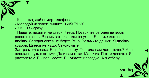 - Красавице, дай ми телефона си! - Записвай: 123456789. - Хм... толкова бързо? - Пиши, пиши, не се притеснявай. Обаждаш ми се днес вечерта точно в шест. В седем се виждаме на вечеря. Не обичам да...