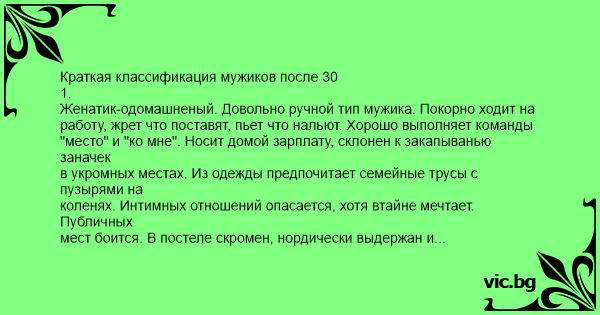 Женатик-одомашненый. Довольно ручной тип мужика. Покорно ходит на