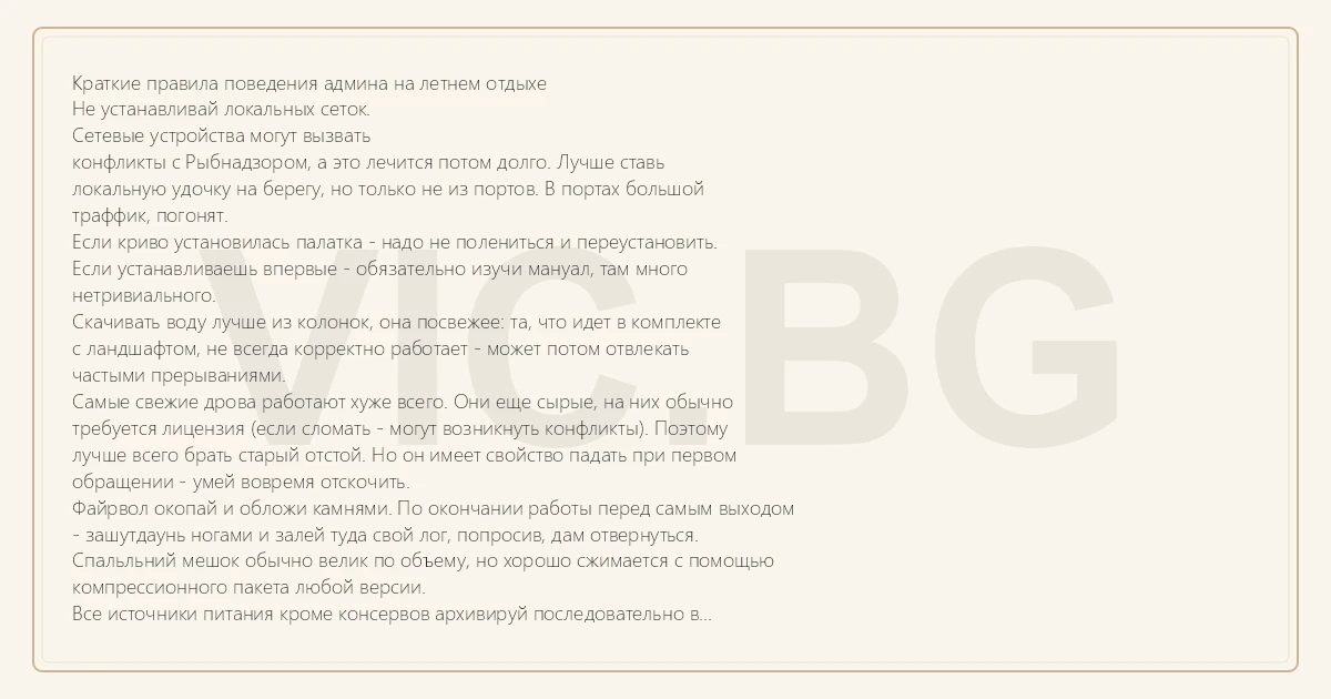 Краткие правила поведения админа на летнем отдыхе Не устанавливай локальных сеток. Сетевые устройства могут вызвать конфликты с Рыбнадзором, а это лечится потом долго. Лучше ставь локальную удочку на берегу, но только не из портов. В портах большой траффик, погонят. Если криво установилась палатка - надо не полениться и пеpеустановить. Если устанавливаешь впервые - обязательно изучи мануал, там много нетривиального. Скачивать воду лучше из колонок, она посвежее: та, что идет в комплекте с ландшафтом, не всегда корректно работает - может потом отвлекать частыми прерываниями. Самые свежие дрова работают хуже всего. Они еще сырые, на них обычно требуется лицензия (если сломать - могут возникнуть конфликты). Поэтому лучше всего брать старый отстой. Но он имеет свойство падать при первом обращении - умей вовремя отскочить. Файрвол окопай и обложи камнями. По окончании работы перед самым выходом - зашутдаунь ногами и залей туда свой лог, попросив, дам отвернуться. Спальльний мешок обычно велик по объему, но хорошо сжимается с помощью компрессионного пакета любой версии. Все источники питания кроме консервов архивируй последовательно в два-три-четыре пакета - иначе после грозы питание может надолго вырубиться. На консервах всегда смотри на версии. Старые версии не используй и не храни - выбрасывай без сомнений, они очень глючат. Следи, чтобы у палатки всегда была хорошая прошивка. Особенно если там установлен какой-нибудь эмулятор виндоус - потенциальная дыра в безопасности. Если есть возможность - поставь себе антивирус против энцефалитного бага и столбняка. Не ставь сам, воспользуйся стандартным доктором - он все пропишет и поставит как надо под лопатку. Собирая рюкзак, не пользуйся комплектами, которые много весят - ищи более легкие и компактные аналоги. Иначе будет проблема с местом. Помни: от частых перезагрузок позвоночника может полететь диск! Восстановить диск - большая проблема. Бережно храни ключи и документацию на себя: в герметичном пакетике в кармане рюкзака. Потеряешь - не восстановишь.