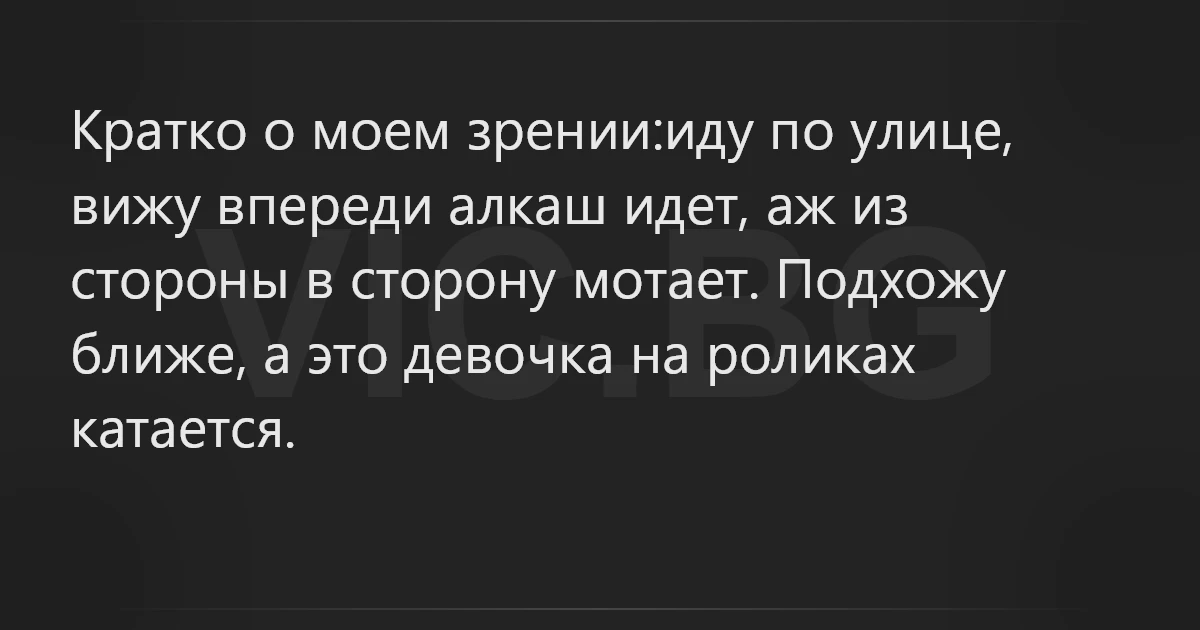 Кратко о моем зрении:иду по улице, вижу впереди алкаш идет, аж из стороны в сторону мотает. Подхожу ближе, а это девочка на роликах катается.