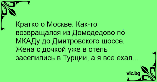 Кратко о Москве. Как-то возвращался из Домодедово по МКАДу до Дмитровского шоссе. Жена с дочкой уже в отель заселились в Турции, а я все ехал...