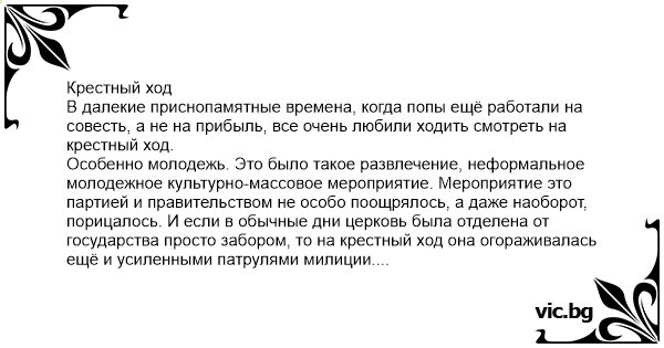 Крестный ход В далекие приснопамятные времена, когда попы ещё работали на совесть, а не на прибыль, все очень любили ходить смотреть на крестный ход.