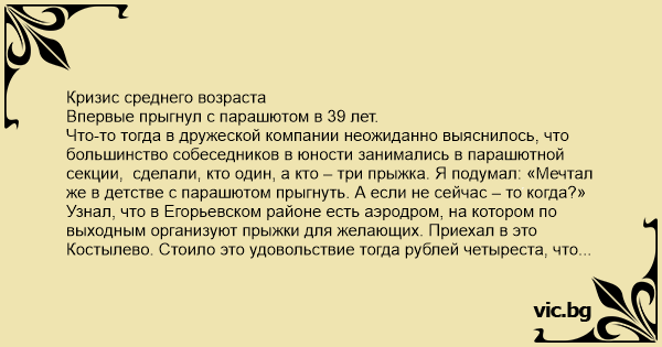 Кризис среднего возраста Впервые прыгнул с парашютом в 39 лет.