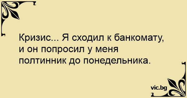 Кризис... Я сходил к банкомату, и он попросил у меня полтинник до понедельника.<br />