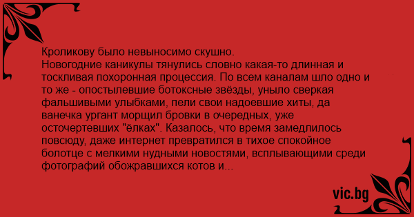 Новогодние каникулы тянулись словно какая-то длинная и тоскливая похоронная процессия. По всем каналам шло одно и то же - опостылевшие ботоксные звёзды, уныло сверкая фальшивыми улыбками, пели свои надоевшие хиты, да ванечка ургант морщил бровки в очередных, уже осточертевших "ёлках". Казалось, что время замедлилось повсюду, даже интернет превратился в тихое спокойное болотце с мелкими нудными новостями, всплывающими среди фотографий обожравшихся котов и заветренных салатов.