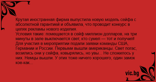 Крутая иностранная фирма выпустила новую модель сейфа с абсолютной гарантией и объявила, что проводит конкурс в целях рекламы нового изделия.