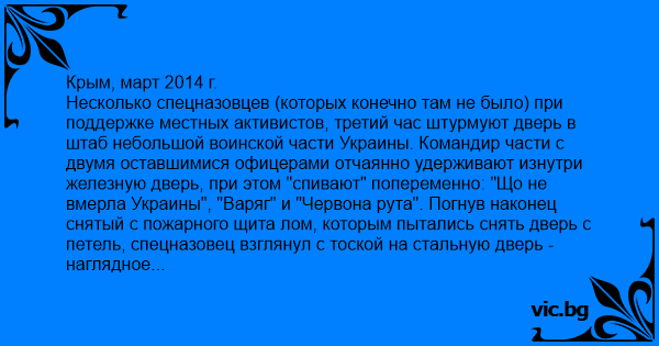 Несколько спецназовцев (которых конечно там не было) при поддержке местных активистов, третий час штурмуют дверь в штаб небольшой воинской части Украины. Командир части с двумя оставшимися офицерами отчаянно удерживают изнутри железную дверь, при этом "спивают" попеременно: "Що не вмерла Украины", "Варяг" и "Червона рута". Погнув наконец снятый с пожарного щита лом, которым пытались снять дверь с петель, спецназовец взглянул с тоской на стальную дверь - наглядное свидетельство высокой квалификации местного прапорщика, и крикнул обороняющимся: "Сдавайтесь, вы окружены, а то сейчас дверь гранатой подорвем". В ответ услышал дружное: "Русские не сдаются!!!" Спецназовец снял балаклаву и растерянно спросил: "А украинцы-то все где?". Раздался лязг запора, дверь приоткрылась и выглянувший не менее растерянный командир ответил: "Так в России все, на заработках! Не вашему ли командиру в Кубинке дачу строят?"