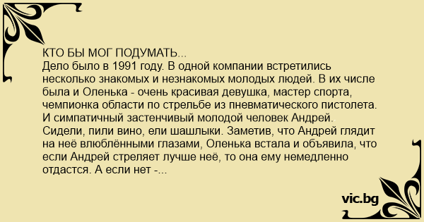 КТО БЫ МОГ ПОДУМАТЬ... Дело было в 1991 году. В одной компании встретились несколько знакомых и незнакомых молодых людей. В их числе была и Оленька - очень красивая девушка, мастер спорта, чемпионка области по стрельбе из пневматического пистолета. И симпатичный застенчивый молодой человек Андрей. Сидели, пили вино, ели шашлыки. Заметив, что Андрей глядит на неё влюблёнными глазами, Оленька встала и объявила, что если Андрей стреляет лучше неё, то она ему немедленно отдастся. А если нет - значит, нет. В чём все присутствующие смогут убедиться завтра в тире. Вот такой попадос... Ну откуда она могла знать, что предложила такое пари инструктору по стрелковой подготовке спецназа ГРУ ГШ ВС СССР?! Вывод: не надо недооценивать людей...