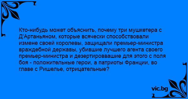 Кто-нибудь может объяснить, почему три мушкетера с Д'Артаньяном, которые всячески способствовали измене своей королевы, защищали премьер-министра враждебной державы, убившие лучшего агента своего премьер-министра и дезертироввашие для этого с поля боя - положительные герои, а патриоты Франции, во главе с Ришелье, отрицательные?