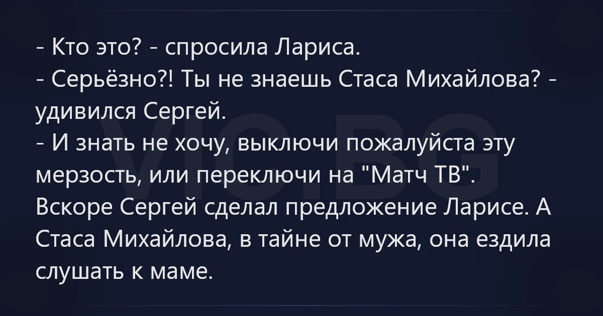 - Кто это? - спросила Лариса. - Серьёзно?! Ты не знаешь Стаса Михайлова? - удивился Сергей. - И знать не хочу, выключи пожалуйста эту мерзость, или переключи на "Матч ТВ". Вскоре Сергей сделал предложение Ларисе. А Стаса Михайлова, в тайне от мужа, она ездила слушать к маме.