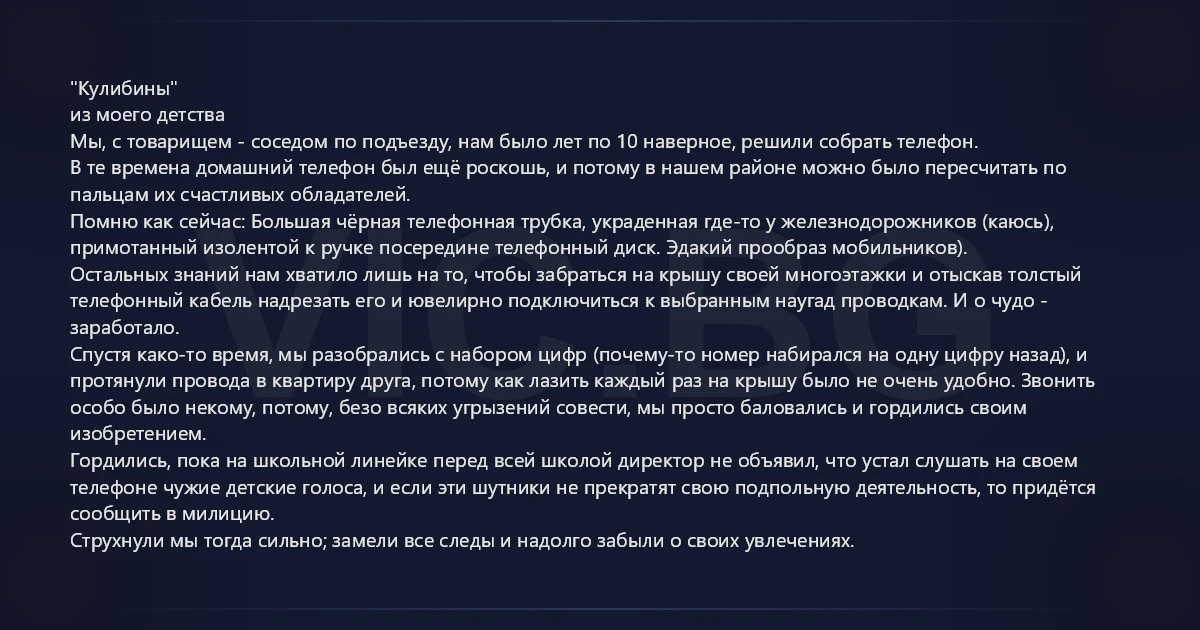"Кулибины" из моего детства Мы, с товарищем - соседом по подъезду, нам было лет по 10 наверное, решили собрать телефон. В те времена домашний телефон был ещё роскошь, и потому в нашем районе можно было пересчитать по пальцам их счастливых обладателей. Помню как сейчас: Большая чёрная телефонная трубка, украденная где-то у железнодорожников (каюсь), примотанный изолентой к ручке посередине телефонный диск. Эдакий прообраз мобильников). Остальных знаний нам хватило лишь на то, чтобы забраться на крышу своей многоэтажки и отыскав толстый телефонный кабель надрезать его и ювелирно подключиться к выбранным наугад проводкам. И о чудо - заработало. Спустя како-то время, мы разобрались с набором цифр (почему-то номер набирался на одну цифру назад), и протянули провода в квартиру друга, потому как лазить каждый раз на крышу было не очень удобно. Звонить особо было некому, потому, безо всяких угрызений совести, мы просто баловались и гордились своим изобретением. Гордились, пока на школьной линейке перед всей школой директор не объявил, что устал слушать на своем телефоне чужие детские голоса, и если эти шутники не прекратят свою подпольную деятельность, то придётся сообщить в милицию. Струхнули мы тогда сильно; замели все следы и надолго забыли о своих увлечениях.