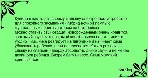 Можно ставить стук сердца (новорожденным очень нравится, знакомый звук), можно самой колыбельную напеть или что угодно - машинка реагирует на движение и начинает сама убаюкивать ребенка, если он проснется. Как-то раз ночью слышу из спальни наверху абсолютно дикие звуки и не менее дикий рев ребенка. Вихрем бегу наверх. Слышу жуткий хриплый бас. Первая мысль - пьяный грабитель или наркоман. В панике врываюсь в комнату ребенка. Там никого, кроме дочки, и этого самого долбаного устройства для спокойного сна, у которого начали садиться батарейки, и оно стало хрипеть замедленным пьяным неузнаваевым басом мои же колыбельные. Как если бы пьяный Мерилин Мэнсон за детские колыбельные взялся.