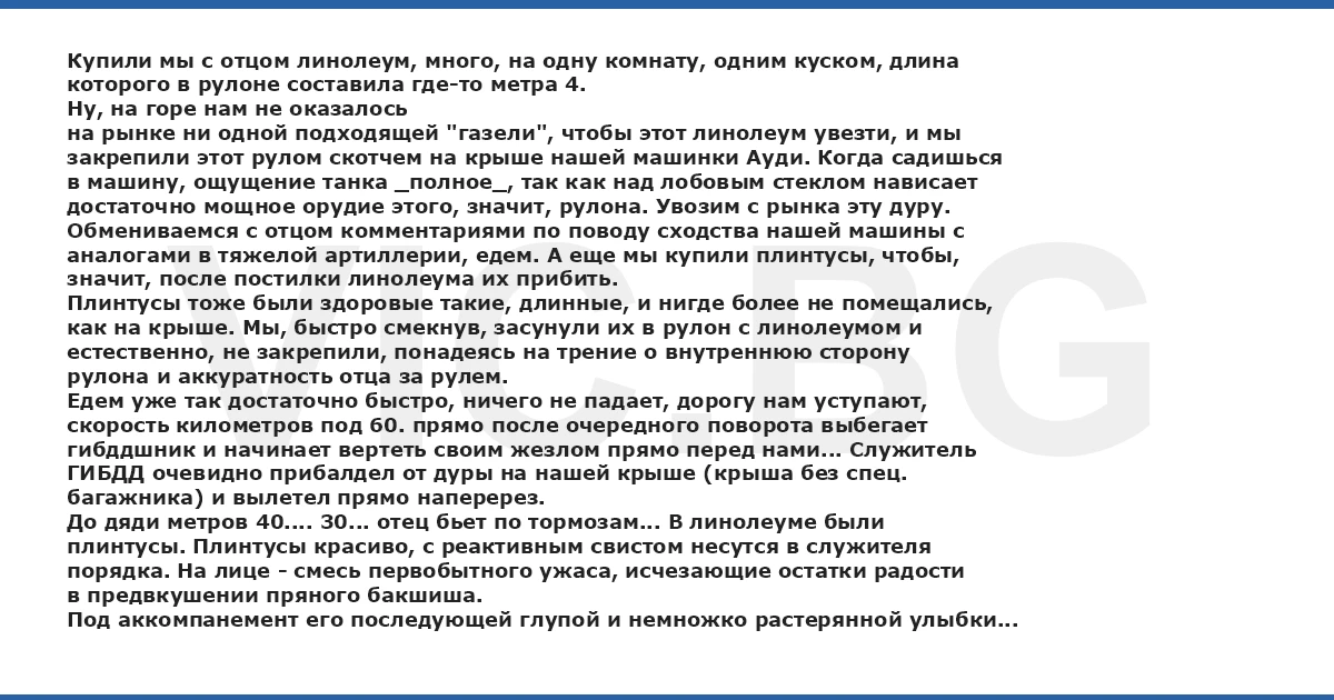 Купили мы с отцом линолеум, много, на одну комнату, одним куском, длина которого в рулоне составила где-то метра 4. Ну, на горе нам не оказалось на рынке ни одной подходящей "газели", чтобы этот линолеум увезти, и мы закрепили этот рулом скотчем на крыше нашей машинки Ауди. Когда садишься в машину, ощущение танка _полное_, так как над лобовым стеклом нависает достаточно мощное орудие этого, значит, рулона. Увозим с рынка эту дуру. Обмениваемся с отцом комментариями по поводу сходства нашей машины с аналогами в тяжелой артиллерии, едем. А еще мы купили плинтусы, чтобы, значит, после постилки линолеума их прибить. Плинтусы тоже были здоровые такие, длинные, и нигде более не помещались, как на крыше. Мы, быстро смекнув, засунули их в рулон с линолеумом и естественно, не закрепили, понадеясь на трение о внутреннюю сторону рулона и аккуратность отца за рулем. Едем уже так достаточно быстро, ничего не падает, дорогу нам уступают, скорость километров под 60. прямо после очередного поворота выбегает гибддшник и начинает вертеть своим жезлом прямо перед нами... Служитель ГИБДД очевидно прибалдел от дуры на нашей крыше (крыша без спец. багажника) и вылетел прямо наперерез. До дяди метров 40.... 30... отец бьет по тормозам... В линолеуме были плинтусы. Плинтусы красиво, с реактивным свистом несутся в служителя порядка. На лице - смесь первобытного ужаса, исчезающие остатки радости в предвкушении пряного бакшиша. Под аккомпанемент его последующей глупой и немножко растерянной улыбки только что избавившегося от груза девственности человека, мы собираем плинтусы, деловито вставляем обратно в трубу и уезжаем.