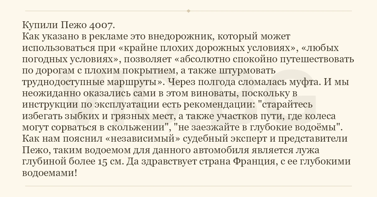 Купили Пежо 4007. Как указано в рекламе это внедорожник, который может использоваться при «крайне плохих дорожных условиях», «любых погодных условиях», позволяет «абсолютно спокойно путешествовать по дорогам с плохим покрытием, а также штурмовать труднодоступные маршруты». Через полгода сломалась муфта. И мы неожиданно оказались сами в этом виноваты, поскольку в инструкции по эксплуатации есть рекомендации: "старайтесь избегать зыбких и грязных мест, а также участков пути, где колеса могут сорваться в скольжении", "не заезжайте в глубокие водоёмы". Как нам пояснил «независимый» судебный эксперт и представители Пежо, таким водоемом для данного автомобиля является лужа глубиной более 15 см. Да здравствует страна Франция, с ее глубокими водоемами!