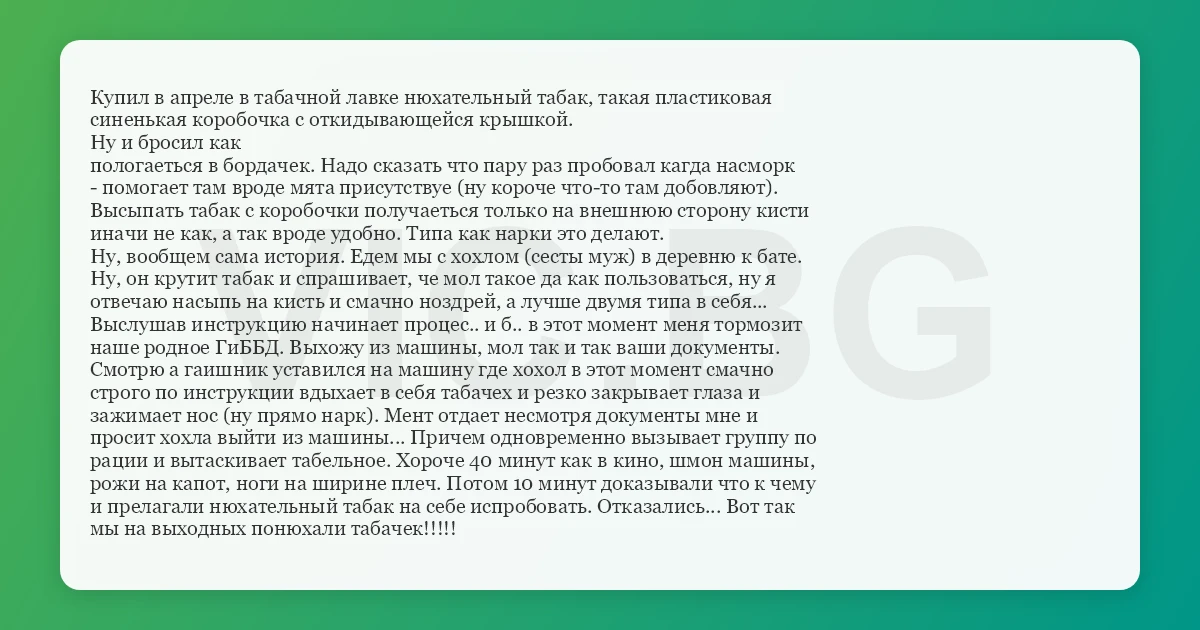 Купил в апреле в табачной лавке нюхательный табак, такая пластиковая синенькая коробочка с откидывающейся крышкой. Ну и бросил как пологаеться в бордачек. Надо сказать что пару раз пробовал кагда насморк - помогает там вроде мята присутствуе (ну короче что-то там добовляют). Высыпать табак с коробочки получаеться только на внешнюю сторону кисти иначи не как, а так вроде удобно. Типа как нарки это делают. Ну, вообщем сама история. Едем мы с хохлом (сесты муж) в деревню к бате. Ну, он крутит табак и спрашивает, че мол такое да как пользоваться, ну я отвечаю насыпь на кисть и смачно ноздрей, а лучше двумя типа в себя... Выслушав инструкцию начинает процес.. и б.. в этот момент меня тормозит наше родное ГиББД. Выхожу из машины, мол так и так ваши документы. Смотрю а гаишник уставился на машину где хoхoл в этот момент смачно строго по инструкции вдыхает в себя табачех и резко закрывает глаза и зажимает нос (ну прямо нарк). Мент отдает несмотря документы мне и просит хохла выйти из машины... Причем одновременно вызывает группу по рации и вытаскивает табельное. Хороче 40 минут как в кино, шмон машины, рожи на капот, ноги на ширине плеч. Потом 10 минут доказывали что к чему и прелагали нюхательный табак на себе испробовать. Отказались... Вот так мы на выходных понюхали табачек!!!!!