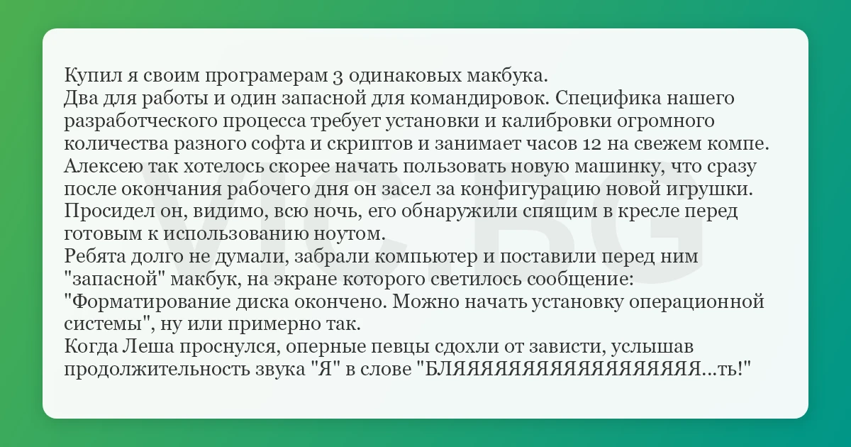 Два для работы и один запасной для командировок. Специфика нашего разработческого процесса требует установки и калибровки огромного количества разного софта и скриптов и занимает часов 12 на свежем компе. Алексею так хотелось скорее начать пользовать новую машинку, что сразу после окончания рабочего дня он засел за конфигурацию новой игрушки. Просидел он, видимо, всю ночь, его обнаружили спящим в кресле перед готовым к использованию ноутом.