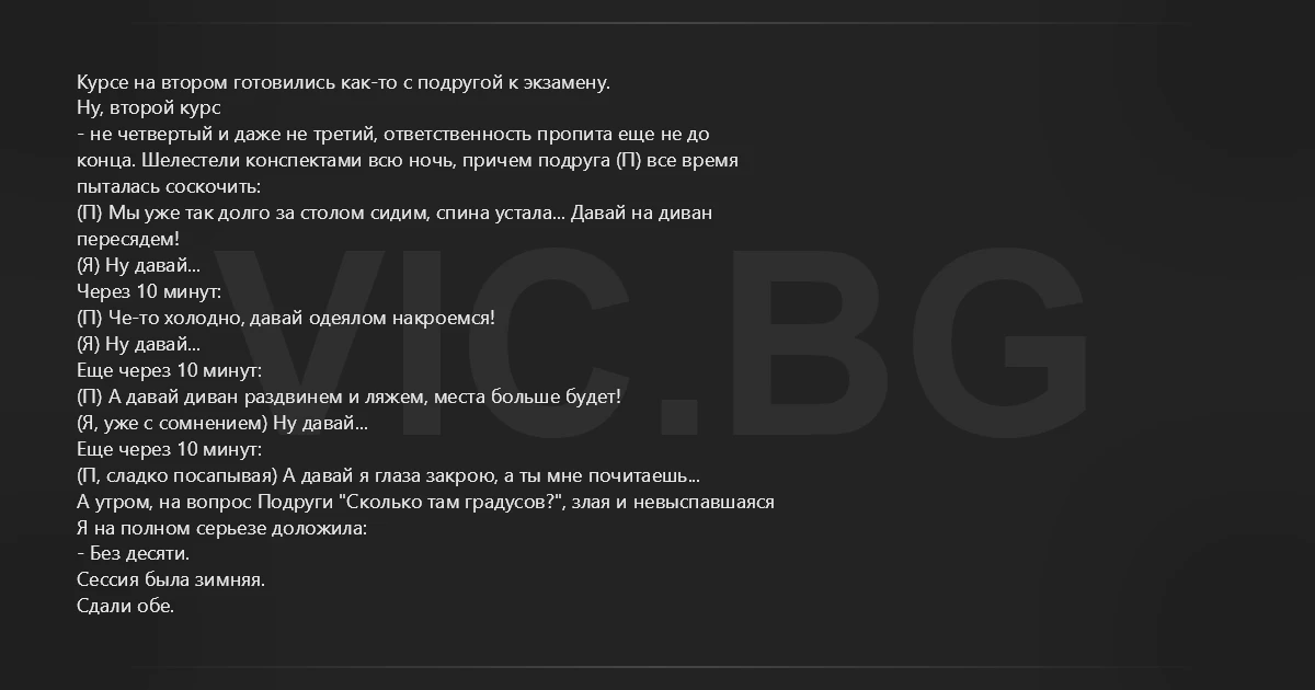Курсе на втором готовились как-то с подругой к экзамену. Ну, второй курс - не четвертый и даже не третий, ответственность пропита еще не до конца. Шелестели конспектами всю ночь, причем подруга (П) все время пыталась соскочить: (П) Мы уже так долго за столом сидим, спина устала... Давай на диван пересядем! (Я) Ну давай... Через 10 минут: (П) Че-то холодно, давай одеялом накроемся! (Я) Ну давай... Еще через 10 минут: (П) А давай диван раздвинем и ляжем, места больше будет! (Я, уже с сомнением) Ну давай... Еще через 10 минут: (П, сладко посапывая) А давай я глаза закрою, а ты мне почитаешь... А утром, на вопрос Подруги "Сколько там градусов?", злая и невыспавшаяся Я на полном серьезе доложила: - Без десяти. Сессия была зимняя. Сдали обе.