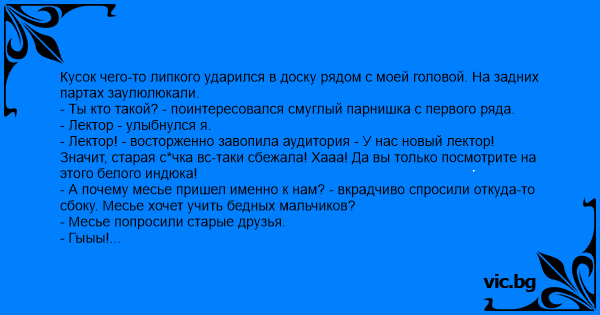 - Лектор! - восторженно завопила аудитория - У нас новый лектор! Значит, старая с*чкa вс-таки сбежала! Хааа! Да вы только посмотрите на этого белого индюка!