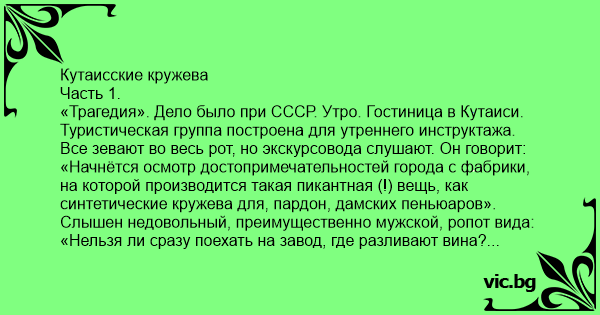 «Трагедия». Дело было при СССР. Утро. Гостиница в Кутаиси. Туристическая группа построена для утреннего инструктажа. Все зевают во весь рот, но экскурсовода слушают. Он говорит: «Начнётся осмотр достопримечательностей города с фабрики, на которой производится такая пикантная (!) вещь, как синтетические кружева для, пардон, дамских пеньюаров». Слышен недовольный, преимущественно мужской, ропот вида: «Нельзя ли сразу поехать на завод, где разливают вина? Подегустировать, как следует». И недовольный, преимущественно женский, ропот вида: "Синтетические кружева - это как пластиковые цветы. Фу... У меня вологодские есть, ещё от бабушки". Экскурсовод что-то там говорит про гармоничное развитие советского человека, которое является истинной целью экскурсии. Предупреждает, что на заводе кружев ничего брать нельзя. На проходной при выходе их всех тщательно проверят. Группа, включая дамскую часть, хмыкает, общий настрой: «Уж что-что, а синтетические кружева и даром не нужны».