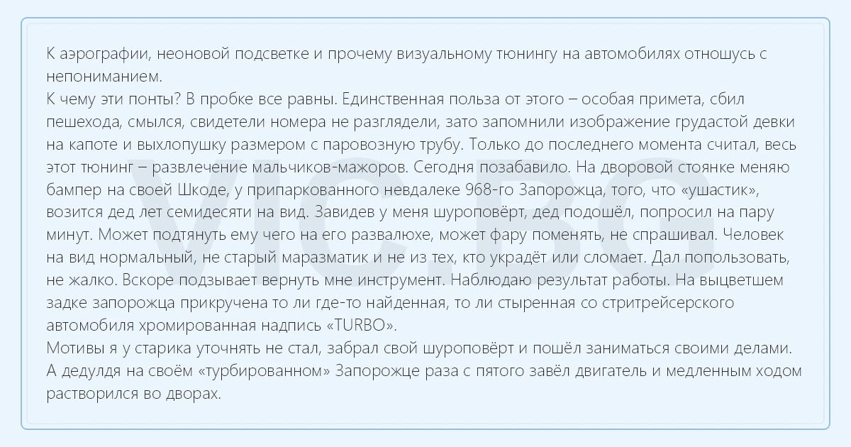 К чему эти понты? В пробке все равны. Единственная польза от этого – особая примета, сбил пешехода, смылся, свидетели номера не разглядели, зато запомнили изображение грудастой девки на капоте и выхлопушку размером с паровозную трубу. Только до последнего момента считал, весь этот тюнинг – развлечение мальчиков-мажоров. Сегодня позабавило. На дворовой стоянке меняю бампер на своей Шкоде, у припаркованного невдалеке 968-го Запорожца, того, что «ушастик», возится дед лет семидесяти на вид. Завидев у меня шуроповёрт, дед подошёл, попросил на пару минут. Может подтянуть ему чего на его развалюхе, может фару поменять, не спрашивал. Человек на вид нормальный, не старый маразматик и не из тех, кто украдёт или сломает. Дал попользовать, не жалко. Вскоре подзывает вернуть мне инструмент. Наблюдаю результат работы. На выцветшем задке запорожца прикручена то ли где-то найденная, то ли стыренная со стритрейсерского автомобиля хромированная надпись «TURBO».