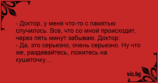 - Доктор, у меня что-то с памятью случилось. Все, что со мной происходит, через пять минут забываю. Доктор: