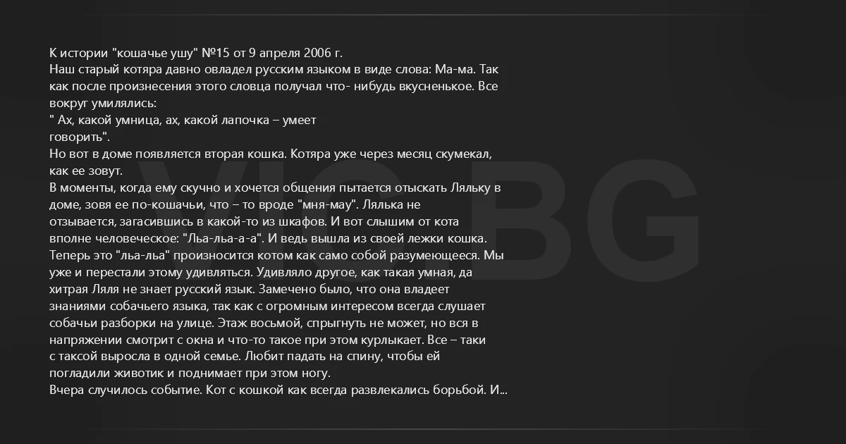 К истории "кошачье ушу" №15 от 9 апреля 2006 г. Наш старый котяра давно овладел русским языком в виде слова: Ма-ма. Так как после произнесения этого словца получал что- нибудь вкусненькое. Все вокруг умилялись: " Ах, какой умница, ах, какой лапочка – умеет говорить". Но вот в доме появляется вторая кошка. Котяра уже через месяц скумекал, как ее зовут. В моменты, когда ему скучно и хочется общения пытается отыскать Ляльку в доме, зовя ее по-кошачьи, что – то вроде "мня-мау". Лялька не отзывается, загасившись в какой-то из шкафов. И вот слышим от кота вполне человеческое: "Льа-льа-а-а". И ведь вышла из своей лежки кошка. Теперь это "льа-льа" произносится котом как само собой разумеющееся. Мы уже и перестали этому удивляться. Удивляло другое, как такая умная, да хитрая Ляля не знает русский язык. Замечено было, что она владеет знаниями собачьего языка, так как с огромным интересом всегда слушает собачьи разборки на улице. Этаж восьмой, спрыгнуть не может, но вся в напряжении смотрит с окна и что-то такое при этом курлыкает. Все – таки с таксой выросла в одной семье. Любит падать на спину, чтобы ей погладили животик и поднимает при этом ногу. Вчера случилось событие. Кот с кошкой как всегда развлекались борьбой. И в какой-то момент кот от злости потерял над собой контроль, и просто впился Ляльке в пузо зубами. Видимо, это было больно, потому что кошка начала повизгивать. Но кошан вошел в раж и еще сильнее сжал челюсти, и тут мы все услышали Лялькин призыв о помощи: - МНЭБОЛНА-А-А-А Что всеми было переведено: мне больно! Помощь была оказана, но закралась мысль, что братья наши меньшие прикидываются, что не умеют говорить. Все зависит от ситуации... Галка Сталинградка