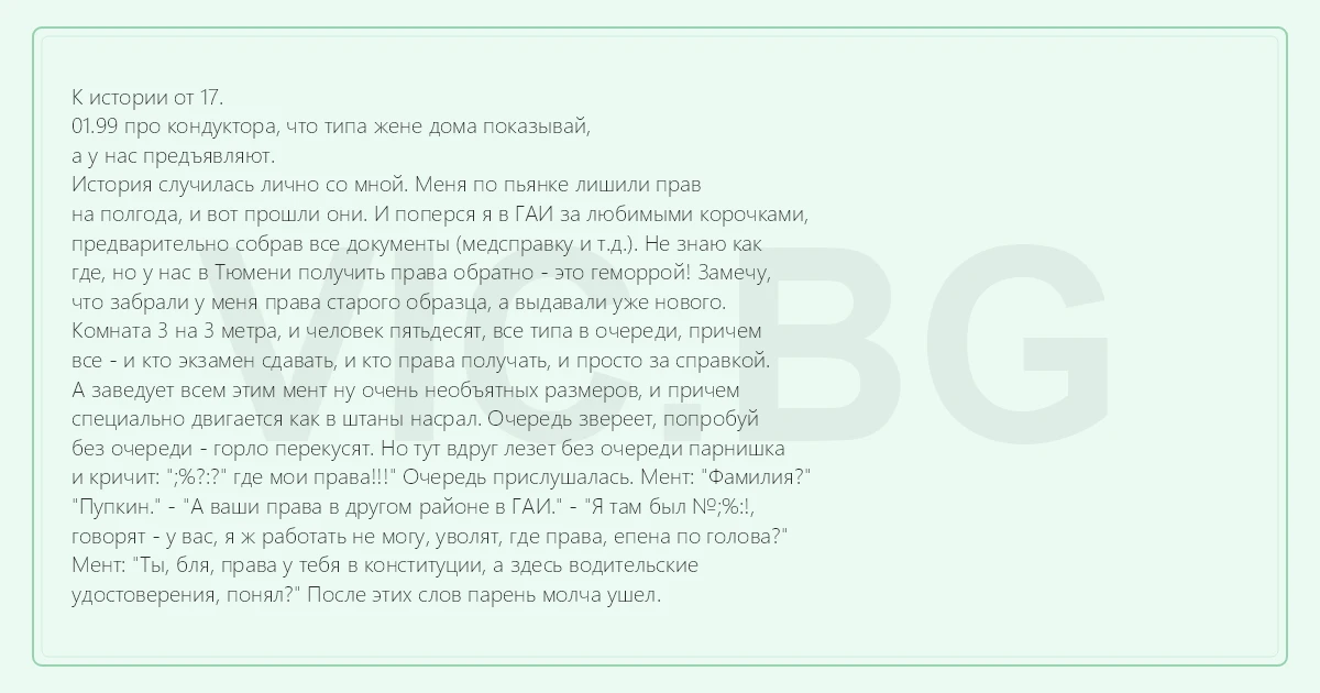 К истории от 17. 01.99 про кондуктора, что типа жене дома показывай, а у нас предъявляют. История случилась лично со мной. Меня по пьянке лишили прав на полгода, и вот прошли они. И поперся я в ГАИ за любимыми корочками, предварительно собрав все документы (медсправку и т.д.). Не знаю как где, но у нас в Тюмени получить права обратно - это геморрой! Замечу, что забрали у меня права старого образца, а выдавали уже нового. Комната 3 на 3 метра, и человек пятьдесят, все типа в очереди, причем все - и кто экзамен сдавать, и кто права получать, и просто за справкой. А заведует всем этим мент ну очень необъятных размеров, и причем специально двигается как в штаны насрал. Очередь звереет, попробуй без очереди - горло перекусят. Но тут вдруг лезет без очереди парнишка и кричит: ";%?:?" где мои права!!!" Очередь прислушалась. Мент: "Фамилия?" "Пупкин." - "А ваши права в другом районе в ГАИ." - "Я там был №;%:!, говорят - у вас, я ж работать не могу, уволят, где права, епена по голова?" Мент: "Ты, бля, права у тебя в конституции, а здесь водительские удостоверения, понял?" После этих слов парень молча ушел.