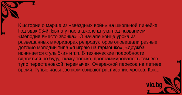 Ничего никому тогда не было, нас с подельником не сдали. Но, недолго музыка играла. Когда этот марш солдат Империи прошёл по коридорам в то же время на следующий день, переключатель из положения «музыка» перевели в положение «звонок». Может, на следующий год и восстановили, но до выпускного о начале и окончании уроков нас хриплым треском оповещали стандартные изделия «звонок громкого боя».