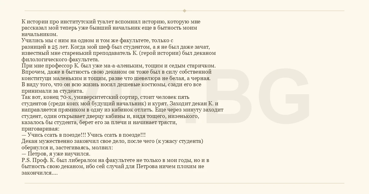 К истории про институтский туалет вспомнил историю, которую мне рассказал мой теперь уже бывший начальник еще в бытность моим начальником. Учились мы с ним на одном и том же факультете, только с разницей в 25 лет. Когда мой шеф был студентом, а я не был даже зачат, известный мне старенький преподаватель К. (герой истории) был деканом филологического факультета. При мне профессор К. был уже ма-а-аленьким, тощим и седым старичком. Впрочем, даже в бытность свою деканом он тоже был в силу собственной конституци маленьким и тощим, разве что шевелюра не белая, а черная. В виду того, что он всю жизнь носил дешевые костюмы, сзади его все принимали за студента. Так вот, конец 70-х, университетский сортир, стоит человек пять студентов (среди коих мой будущий начальник) и курят. Заходит декан К. и направляется прямиком в одну из кабинок отлить. Еще через минуту заходит студент, один открывает дверцу кабины и, видя тощего, низенького, казалось бы студента, берет его за плечи и начинает трясти, приговаривая: — Учись ссать в поезде!!! Учись ссать в поезде!!! Декан мужественно закончил свое дело, после чего (к ужасу студента) обернулся и, застегиваясь, молвил: — Петров, я уже научился. P.S. Проф. К. был либералом на факультете не только в мои годы, но и в бытность свою деканом, ибо сей случай для Петрова ничем плохим не закончился. Некто Вадим