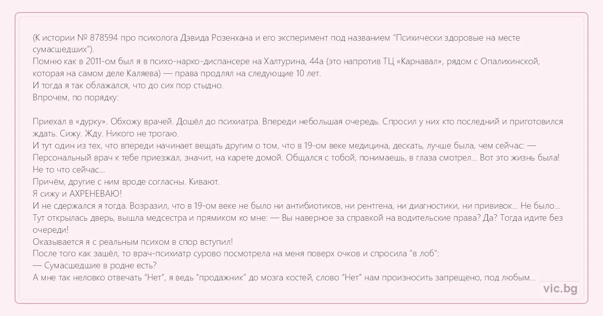 (К истории № 878594 про психолога Дэвида Розенхана и его эксперимент под названием "Психически здоровые на месте сумасшедших").